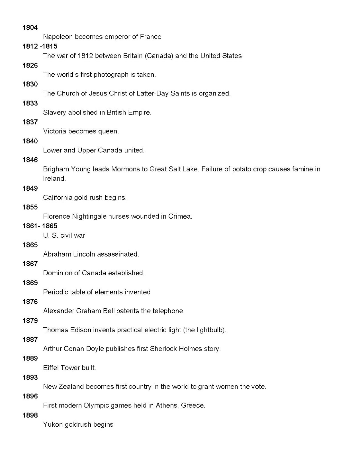For the historical events I prepared a world history handout using information I found on infoplease.com. I selected events that I thought the youth in my (Canadian) ward would recognize, so you may want to prepare your own for the youth in your area.